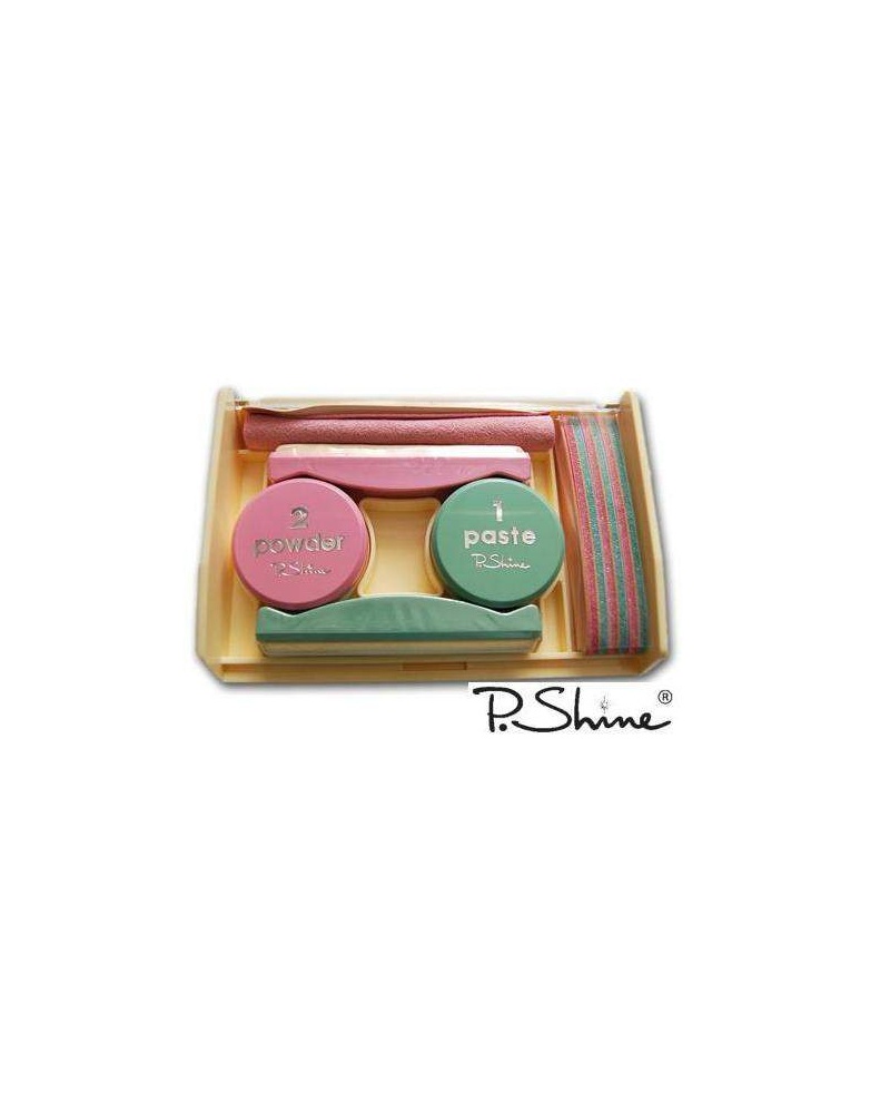 Sada P-shine je založena na přírodní bázi, je určena pro regeneraci přírodních nehtů. Hlavními složkami jsou včelí pyl a křemičitá hlinka. Křemičitá hlinka je hornina, která se nachází v přírodě, skládá se z mikroskopických křemičitých částí, někdy i s menším podílem písku. Včelí pyl se skládá z aminokyselin, sacharidu, glukózy, fruktózy, sacharózy, tuků, lecitinu, mastných kyselin, fermentu, minerálních látek-Ca,Mg,G,K,P,Cu, Si, Na, CL, S, dále z karotenu, rutinu, vitaminy C,B1,B2,B5,B6, přírodních hormonů…P-shine je vhodný na nehty – roztřepené, lámavé, špatně rostoucí. P-shine není vhodný nanášet na tenké nehty a ani po sundání nehtů umělých. Principem je totiž leštění a to je pro poškozené nehty nevhodné. Při doplňování vyhlazujte pilníčkem jen novou odrostlou část nehtů. Naneste pastu(křemičitou hlinku) a poté na celý nehet naneste pudr(včelí pyl). Při prvním leštění se P-shine doplňuje po 14-ti dnech. Poté opakujeme cca po 3-4 týdnech. Pokud nebyl P-shine od prvního nanesení dlouho aplikován, tak je nutné opakovat všechny čtyři základní kroky. Po nanesení P-shinu již není třeba lakovat, protože se nehty krásně lesknou. Tři dny po aplikaci P-shinu se nedoporučuje lakovat, protože by Vám lak na nehtech nedržel z důvodů silného prokr Postup P-SHINE modeláže: