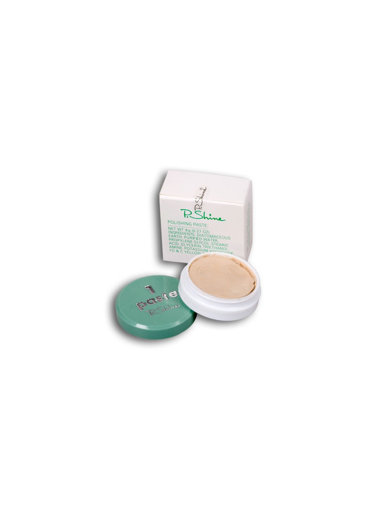 P-Shine pasta: vhodná pro první krok manikúry. Nehty lehce zbrousíme jedním směrem zeleným pilníčkem, nabereme na špachtličku zelenou pastu, přeneseme na zelenou leštičku a opatrně zapracujeme pastu do nehtu